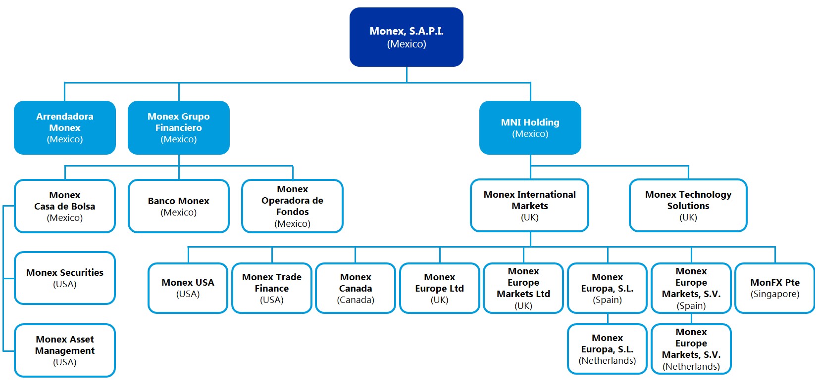 Monex operates in Mexico, United States, Canada, United Kingdom, Spain, Netherlands, and Singapore. We establish our presence in these countries through several companies: we operate in Mexico through Monex Grupo Financiero, which comprises Banco Monex, Monex Casa de Bolsa and Monex Operadora de Fondos, as well as with Arrendadora Monex; in the United States of America through Monex USA, Monex Securities, and Monex Asset Management; in Canada through Monex Canada; in the United Kingdom through Monex Europe and Monex Europe Markets; in Spain and its branches in the Netherlands through Monex Europe Markets and Monex Europa, S.L.; and in Singapore through MonFX.